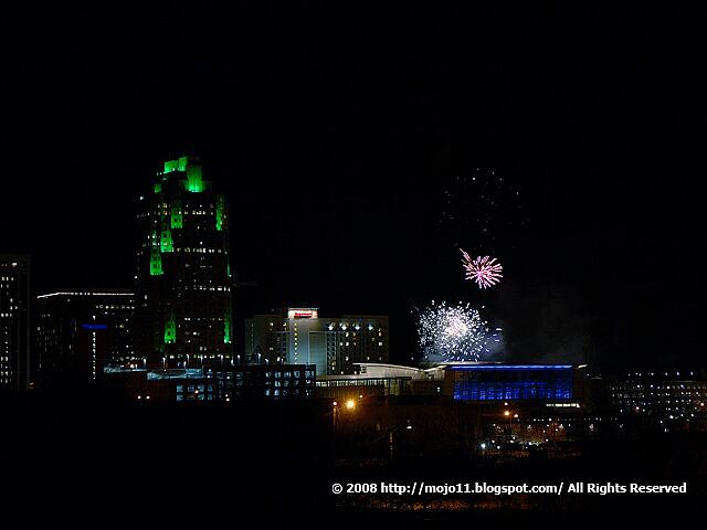 Okay, so maybe this is cheating a little. Yes, I could've used this one for the "Holiday" theme but I didn't. And now I'm glad I didn't, because the latest Thematic Photographic prompt is "New" and while there's some obvious newness going on here, there's some that's not so obvious to those living somewhere that's... not here.Here we have (pretty obviously) New Year's Eve with the fireworks sparkling about the (not so obviously) new Raleigh Civic and Convention Center completed in late 2008 (that's the building with the blue lighted windows.). All of this took place on the "newly reopened" Fayetteville Street which for the last 30 years or so had been closed to vehicular traffic and bricked over to create Fayetteville Street Mall. That never worked out all that well, so the city planners finally junked the idea and reopened the street which runs from the Capitol Building at the north end to the Progress Energy Center for the Performing Arts at the south end. (It might just be the most controversial 8 blocks in town.)